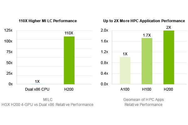 また、H200は従来のCPU (Xeon® Platinum 8480+ 2CPU) と比べて、110倍の速さでデータを処理でき、高速なメモリ帯域幅は、科学研究やAI開発など技術革新を加速させる上で不可欠な存在となります。