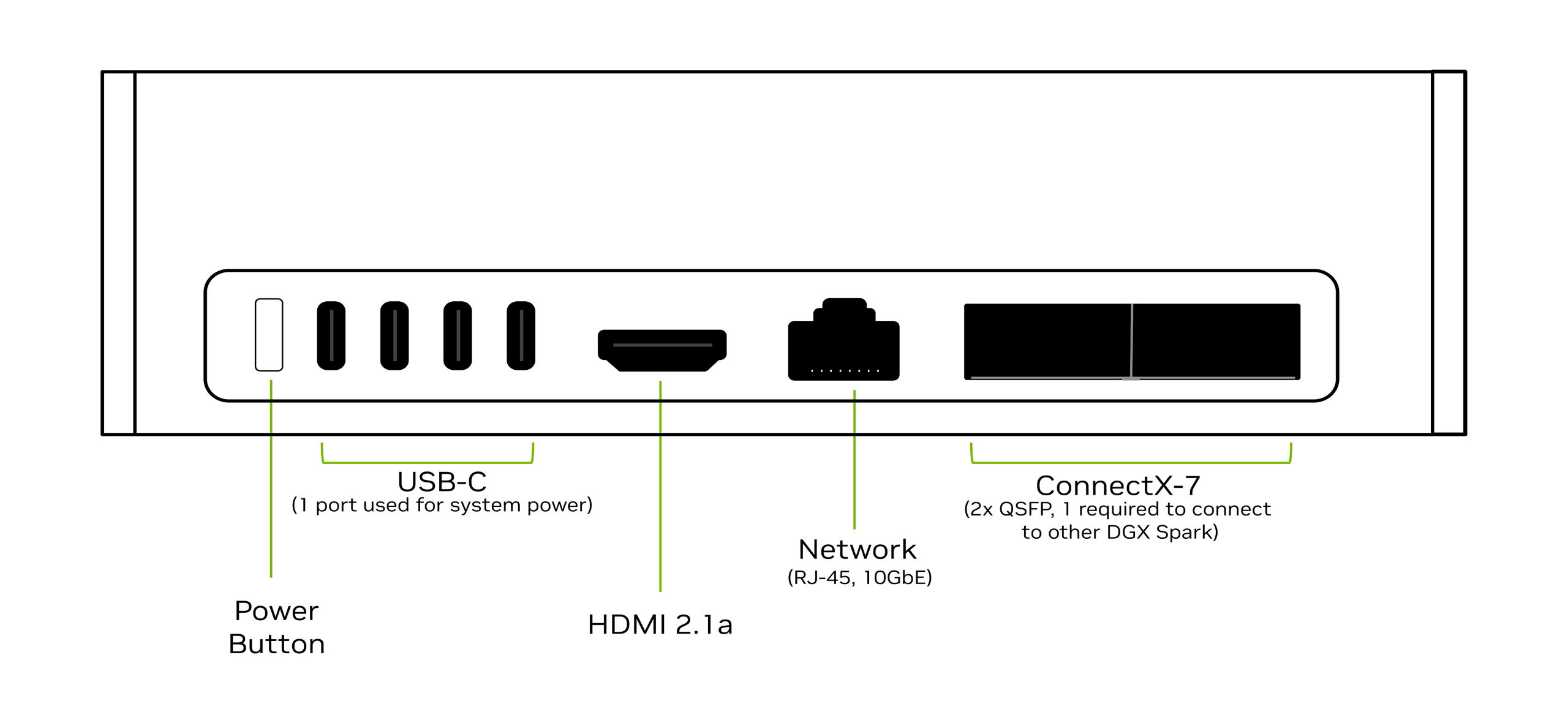 電源ボタンの隣には4つのUSB-Cポートがあります。1つのポートはDGX Sparkに電力を供給するために使用され、残りの3つはユーザーのために空いています。