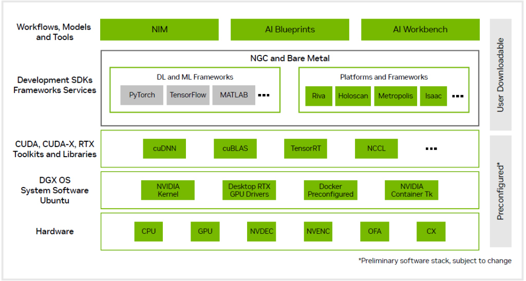 DGX Sparkは、産業用向けにAI製品やサービスを生産するためのシステムやプロセスを稼働する際、システムの設計と開発における基盤となるソフトウェアアーキテクチャを搭載しています。Ubuntu Linuxを搭載したNVIDIA DGX OSを使用し、最新のNVIDIA AIソフトウェアスタックで事前構成され、NVIDIA NIM™ とNVIDIAブループリントへの開発者プログラムアクセスとともに、開発者はPytorch、Jupyter、Ollamaなどの一般的なツールを使用して、DGX Spark上でプロトタイプ作成、微調整、推論を行い、データセンターやクラウドにシームレスに展開することができます。