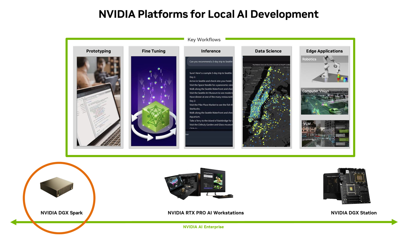NVIDIA のフルスタック AI プラットフォームにより、DGX Spark ユーザーは、デスクトップから DGX CloudやあらゆるGPUクラウドやデータセンターインフラにシームレスにAIモデルを移動でき、ワークフローのプロトタイプを作成したり、ファインチューニングを行うなどの反復がこれまで以上に容易になります。